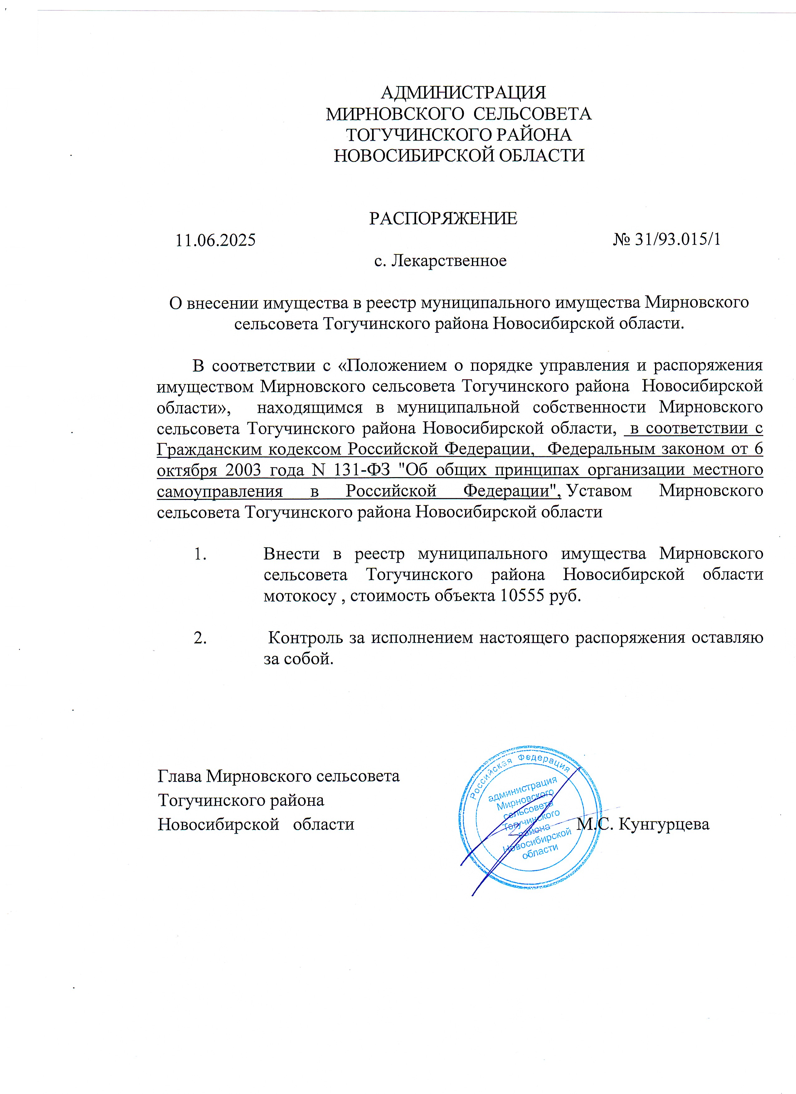 от 25 ноября 2025 О внесении имущества в реестр муниципального имущества Мирновского сельсовета Тогучинского района Новосибирской области